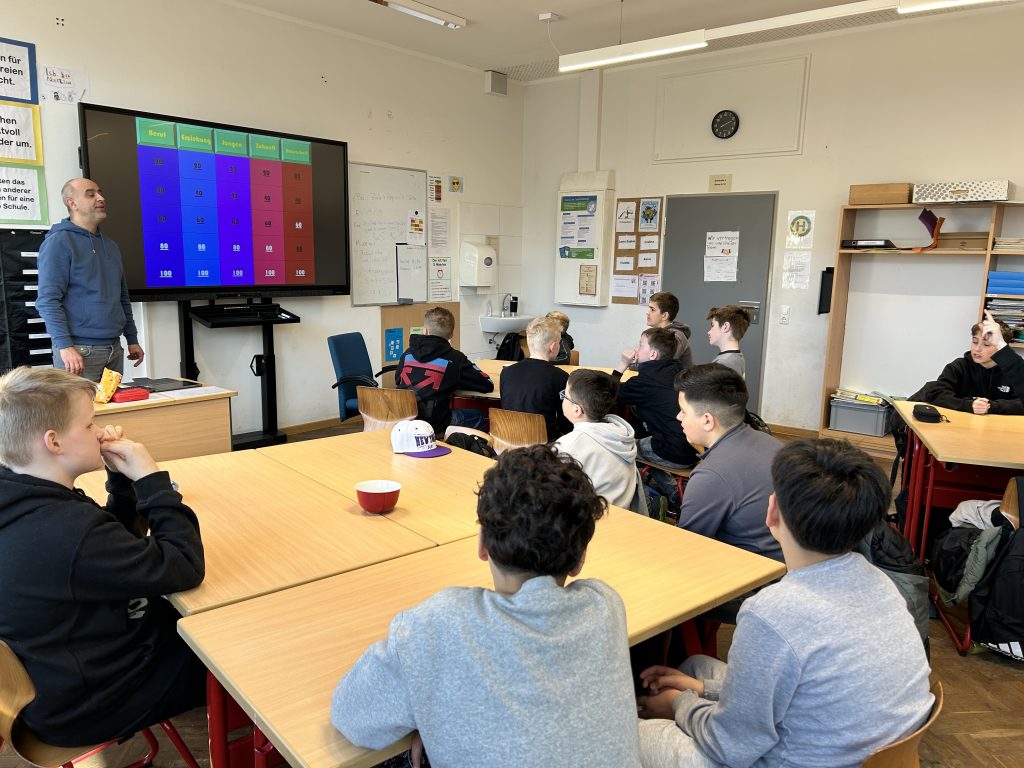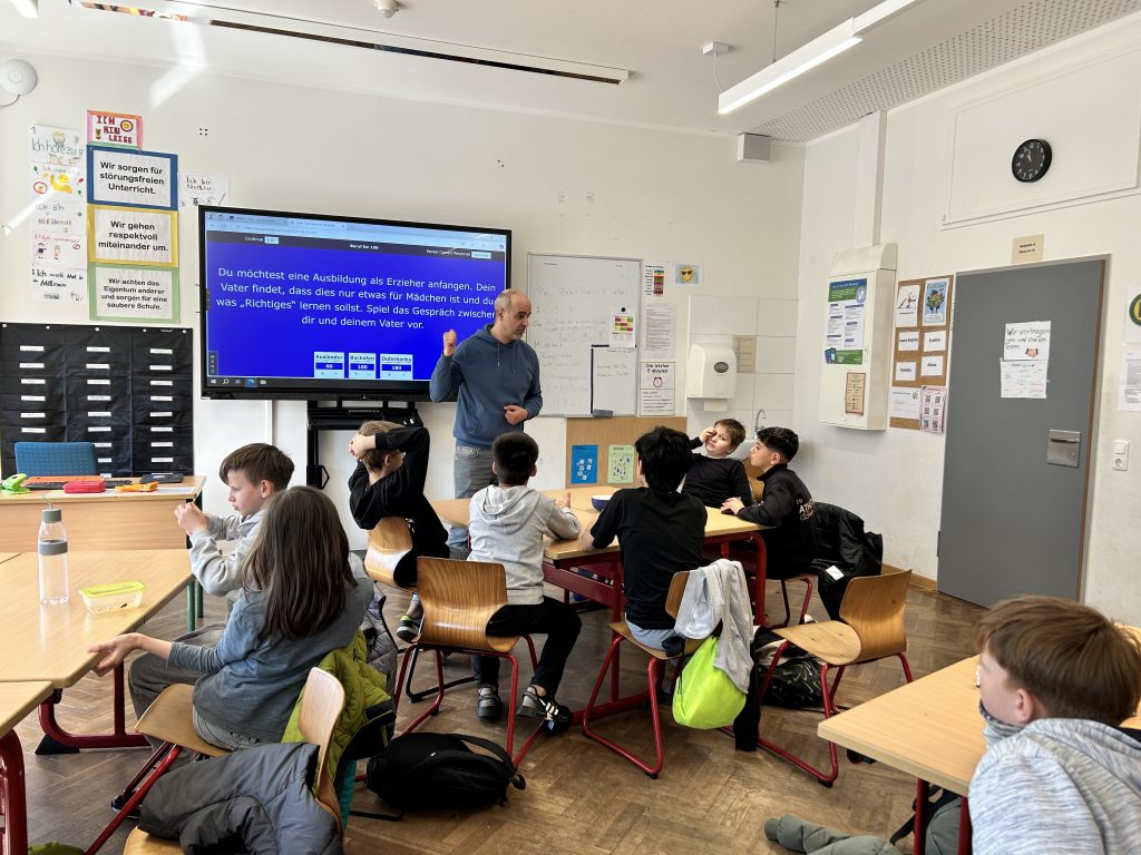 Ein ganz anderes Erlebnis bot die Station „Mannopoli“ bei Lehrer Christian Amrani, in der es um eine spielerische Auseinandersetzung mit der Rolle des Mannes ging. Durch Rollenspiele, Pantomime und Diskussionsfragen näherten sich die Schüler dem Thema auf kreative Weise. Dabei zeigte sich, dass einige Rollenklischees bereits bei jungen Schülern sichtbar sind. In der anschließenden Reflexionsrunde wurde gemeinsam hinterfragt, warum viele Jungen automatisch in stereotype Rollenbilder schlüpfen.