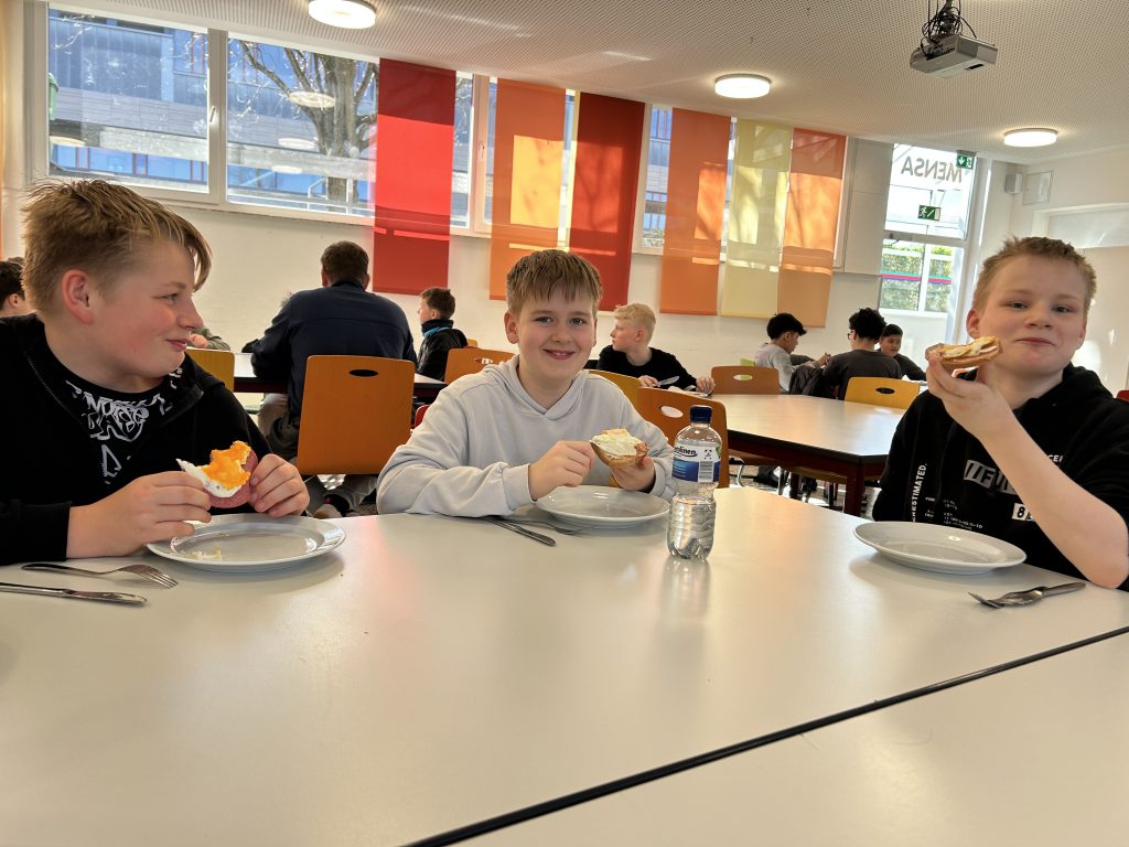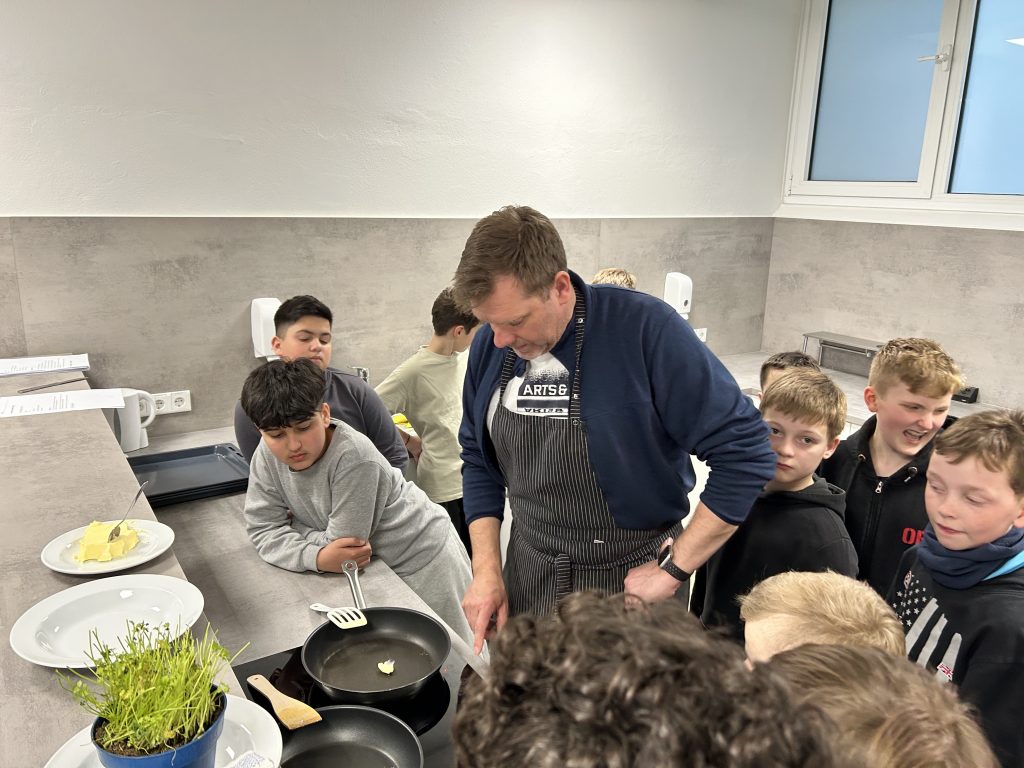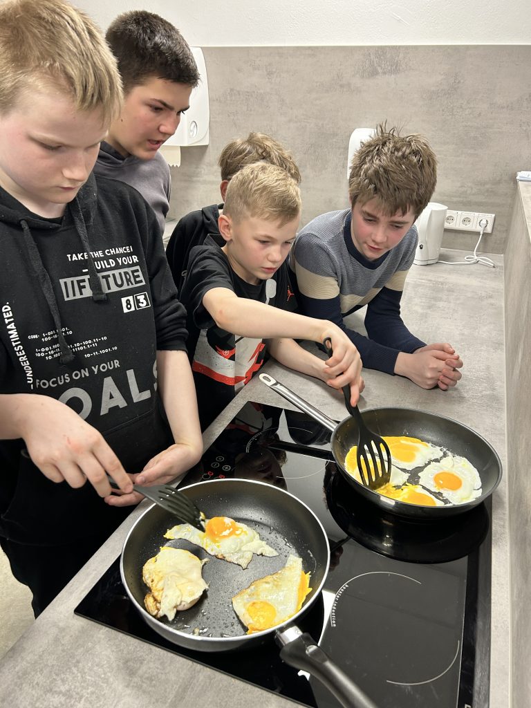 Ganz praktisch wurde es an der Station von Lehrer Sebastian Boldt. In der Schulküche versuchten sich die Schüler am Braten von Spiegeleiern – für viele eine Premiere. Natürlich durfte das gebratene Spiegelei danach selbst gegessen werden, aber auch das Abspülen, Aufräumen und sauber Putzen der Arbeitsfläche, zuhause oftmals noch von der Mutter erledigt, gehörte anschließend mit zu dem Programm.