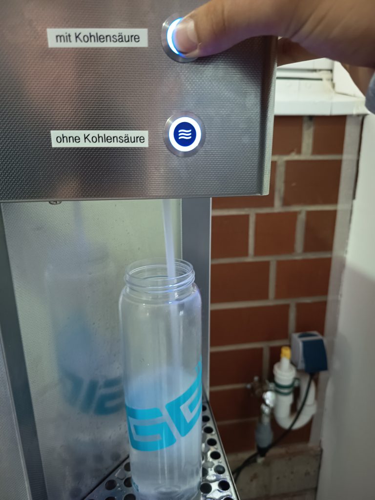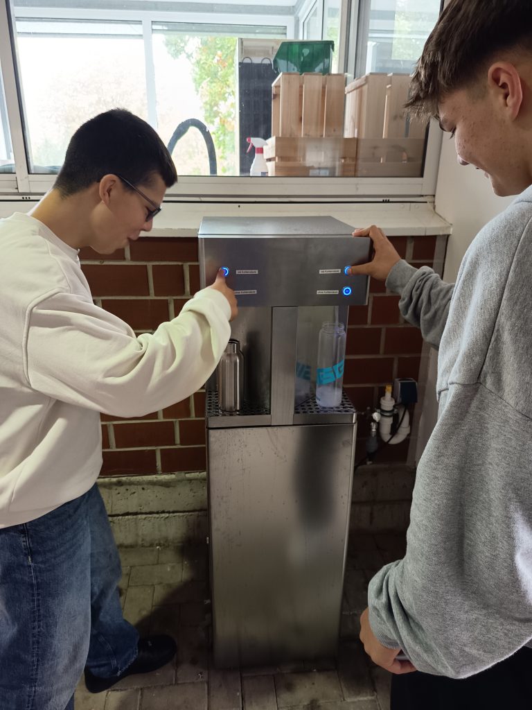 An zwei Zapfstellen können alle Schülerinnen und Schüler kostenlos Wasser in ihre Flaschen füllen. Das Wasser wird gefiltert, gekühlt und man kann zwischen den Varianten Kohlensäure und Still wählen.